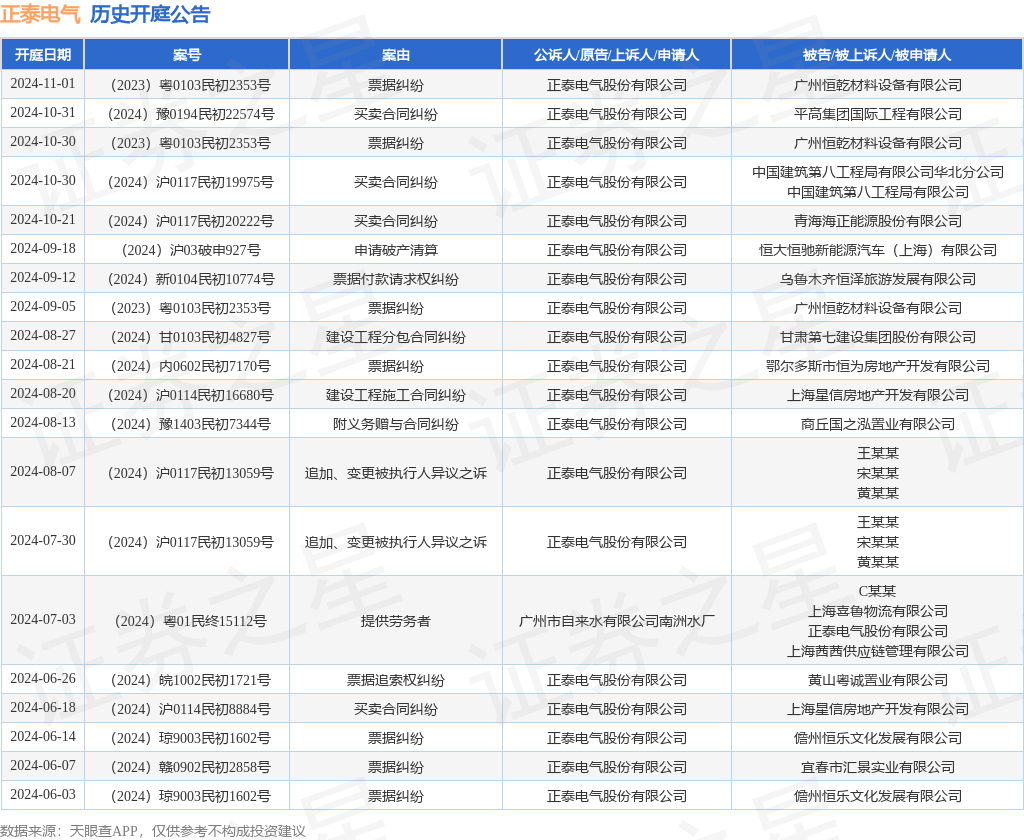 案号:(2023)粤0103民初2353号审理法院:广州市荔湾区人民法院案由:票据纠纷当事人信息: 原告/上诉人:正泰电气股份有限公司 被告/被上诉人:广州恒乾材料设备有限公司开庭日期:2024年11月1日根据统计,近一年内以正泰电气股份有限公司为当事人的历史开庭公告有180则,其中案由为“票据纠纷”的公告以121则居首,其次为“票据付款请求权纠纷”有19则,“买卖合同纠纷”有16则。历史开庭公告(前20条)如下: